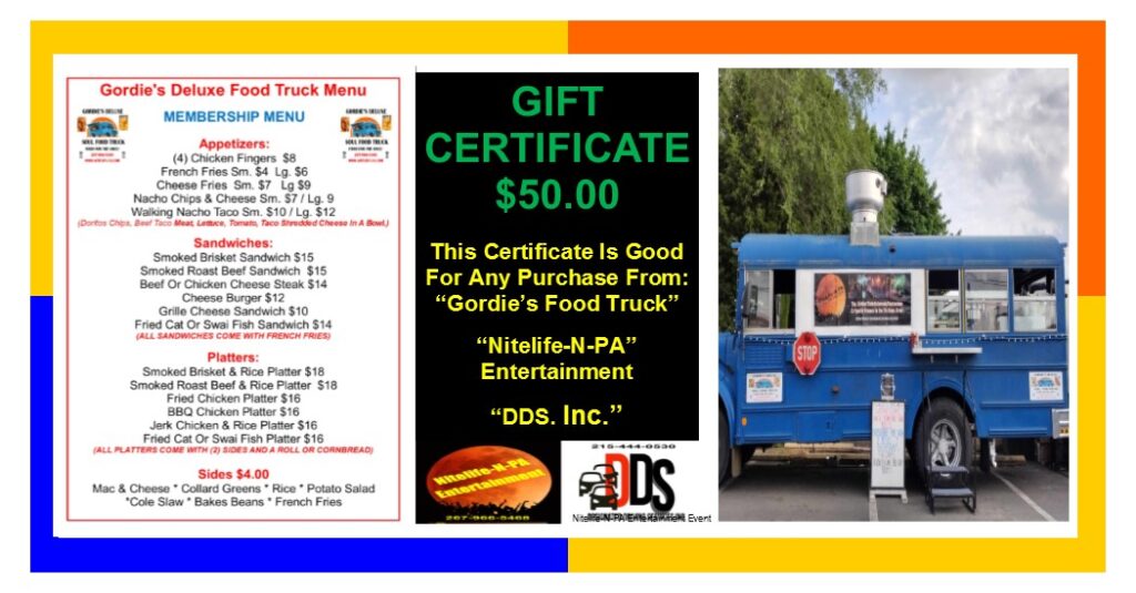 This Certificate will give you $50 off Gordie’s Deluxe Food Truck, Nitelife-N-PA Entertainment and DDS, Inc. is thrilled to invite you to become a member and participate in our exciting events, all in support of DDS, Inc. and their mission to assist retired veterans part-time employment.
